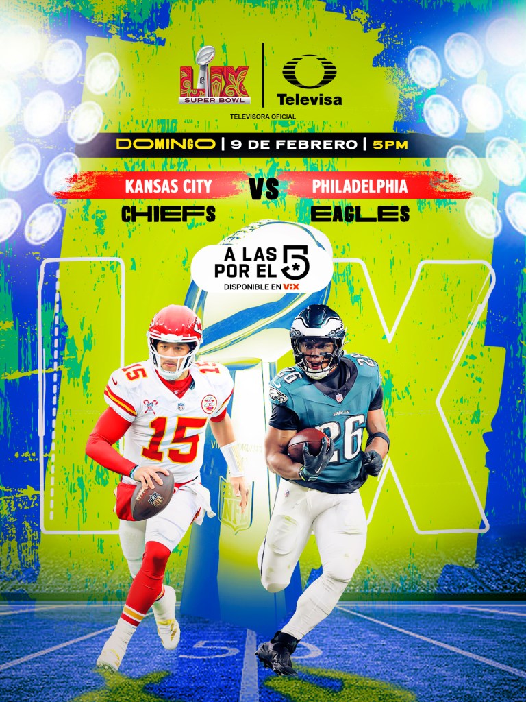 Este domingo, 9 de febrero, se celebrará el Super Bowl LIX entre los Jefes de Kansas City y las Águilas de Philadelphia, y en TelevisaUnivision tenemos todo listo para llevar de manera gratuita a millones de hogares mexicanos la mejor cobertura del gran encuentro a las 5:00 pm por el Canal 5.