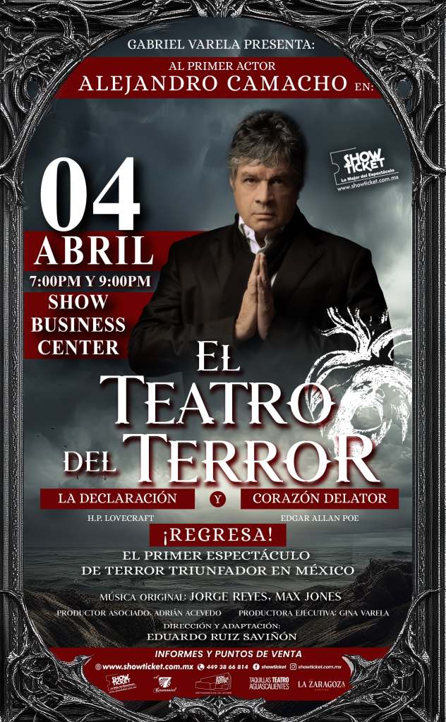 “El teatro del Terror”, protagonizada por Alejandro Camacho, se estrena el próximo 28 de marzo. Los boletos se pueden comprar en TicketPoint.Mx y en las taquillas del recinto, además de que saldrá de gira por Zacatecas, Aguascalientes y toda la República (Saltillo, Monterrey, Torreón, Tijuana, Mexicali, con funciones agotadas) y hará cuatro funciones los jueves, a partir del 8 de mayo, en el teatro “Silvia Pinal” de la CDMX.